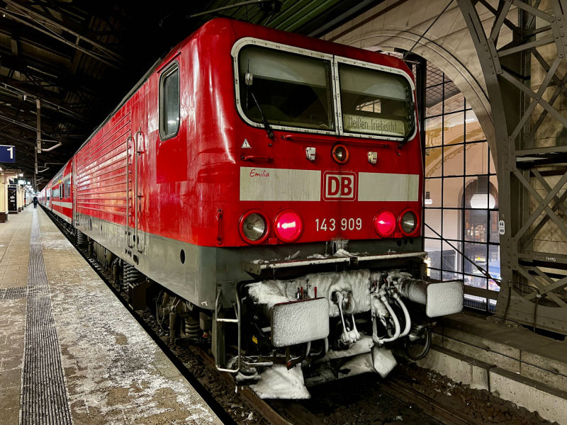 Bild 1: Lok 143 909 "Emilia" am 12. Januar 2026 in Dresden Neustadt mit der S1 nach Meißen-Triebischtal