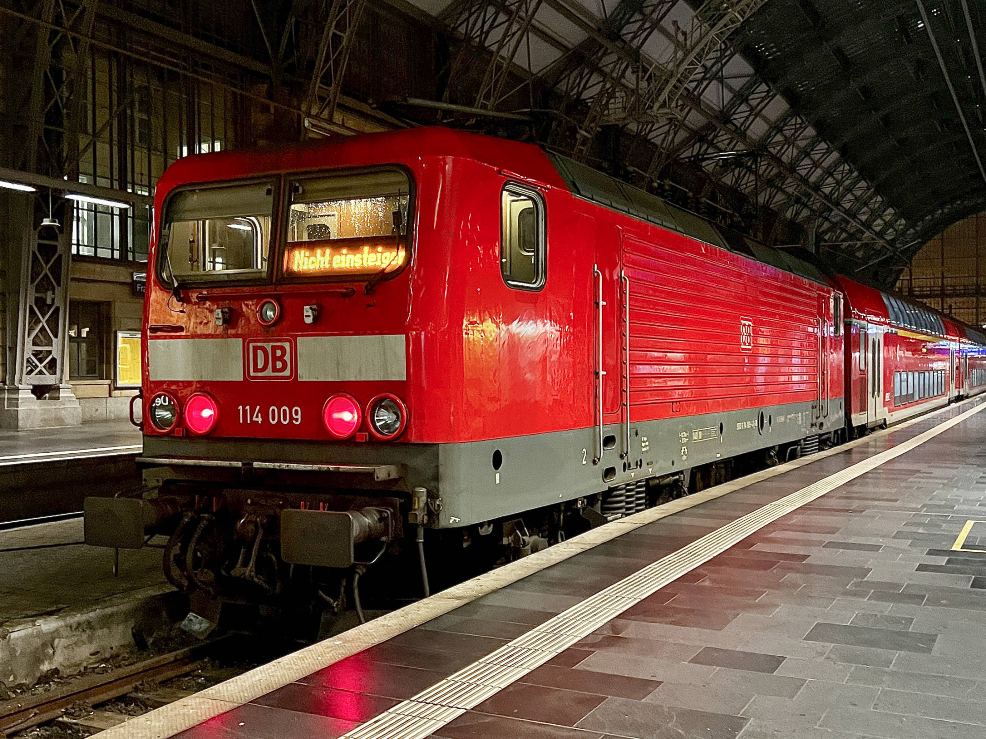 Mit Blick in Richtung Querbahnsteig des Leipziger Hauptbahnhofes schob die Lok ER 20-015 (BEACON / Schienen Komplex Logistik (SKL)) (Bild 1) am Abend des 28.04.2025 den aus Chemnitz kommenden Zug. Unmittelbar dahinter befand sich der Wagen D-WFL 50 80 26-35 214-8, Bauart DBpza 751.2 (Bild 2), bei dem eine Tür gestört war und nicht benutzt werden konnte (Bild 3).